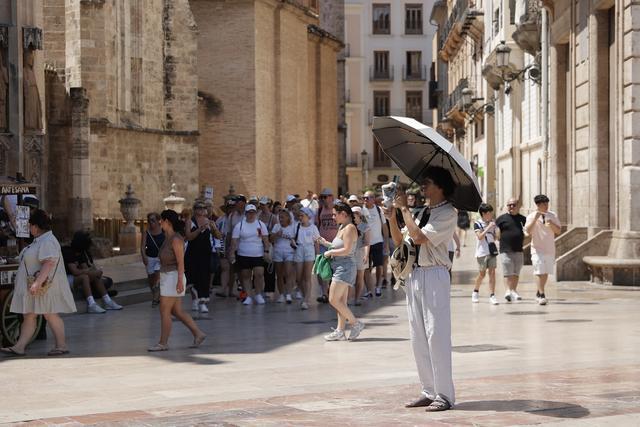 6月29日,在西班牙巴伦西亚,游客打伞遮阳。(新华社发)